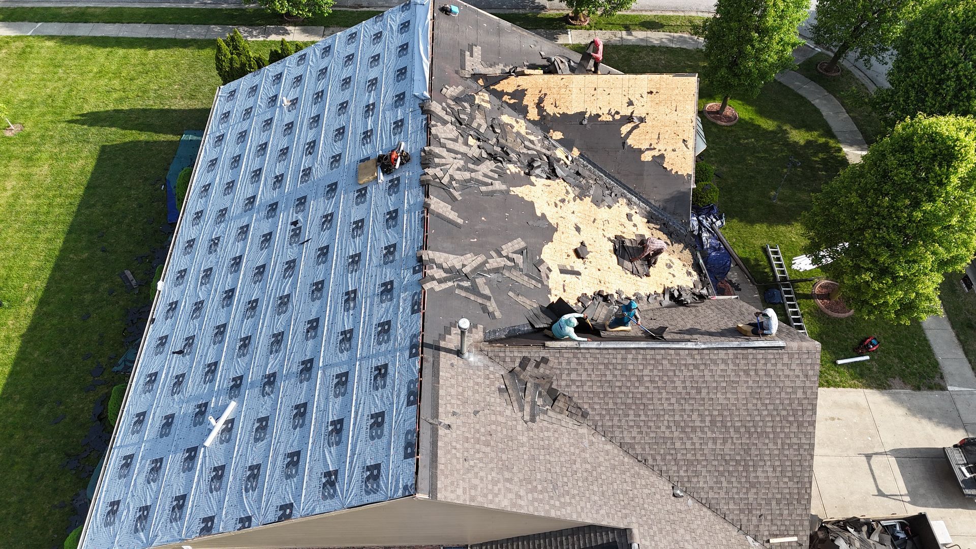 We use protective measures such as plywood roof walkers, tarps, and careful equipment handling to safeguard your landscaping, gutters, and exterior surfaces throughout the project.